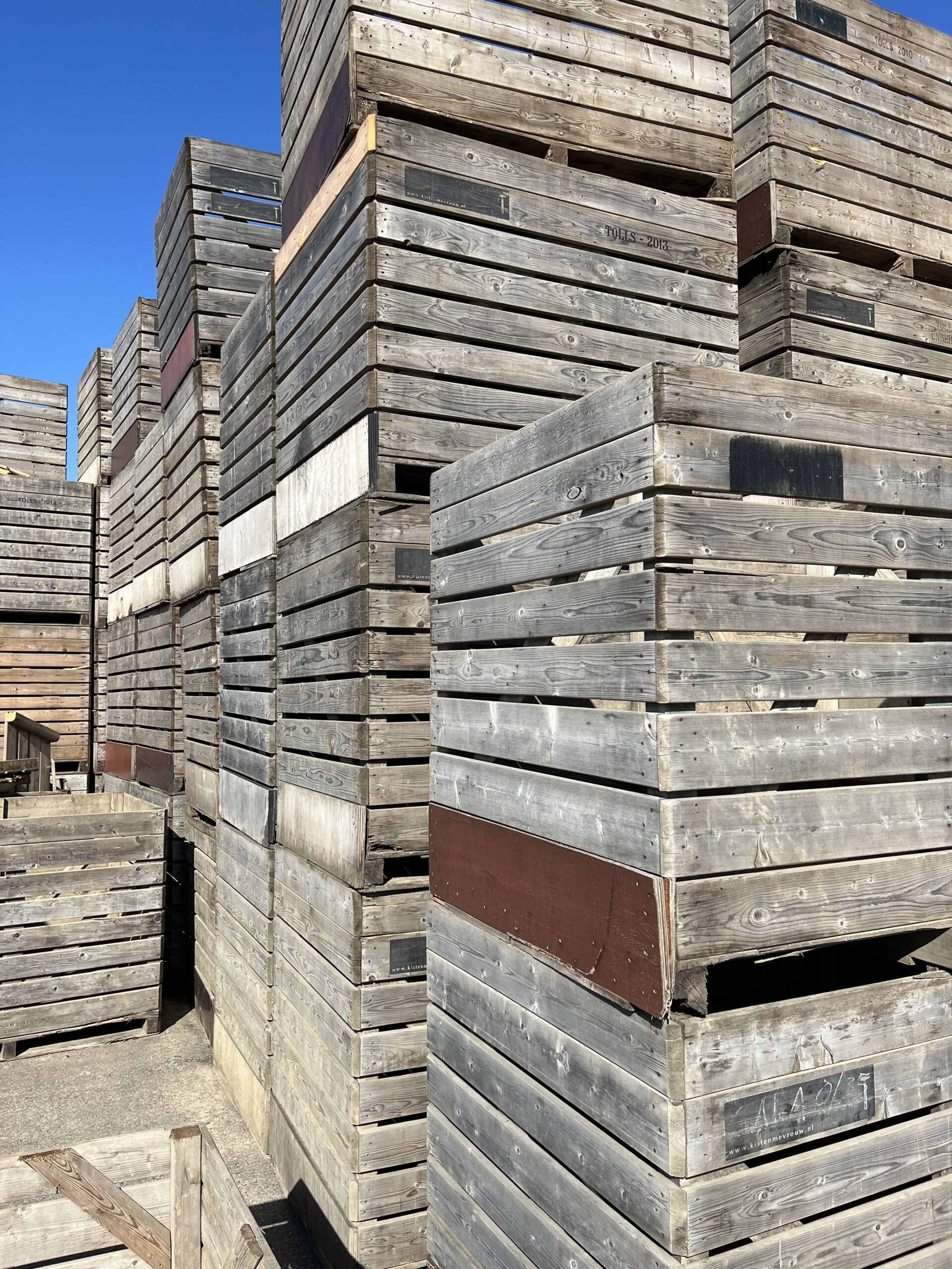 Approx. 150 used crates, unrepaired and partly fitted with double bracing, for sale.